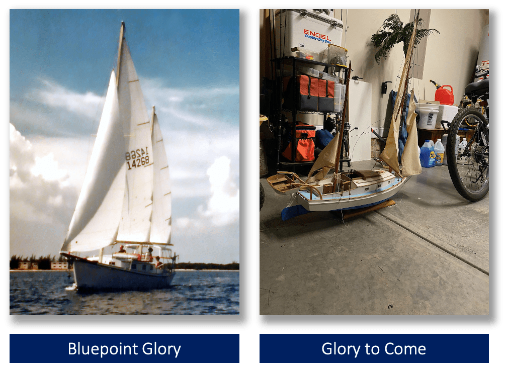 I must admit that I already have eyes on my next project. Roy Hedenberg became my stepfather and Pawpaw to my children late in his life. Living until his early 90s, Pawpaw was both a sailor and boatbuilder of remarkable skills. He and Mother met, married, and lived in Key West, where Roy singlehandedly built a 35-foot motored sailboat, The Bluepoint, from a design used by Chesapeake Bay oystermen—to sail the shallow waters. In typical Pawpaw fashion, he built a one-tenth scale replica before he built the real thing. My oldest son inherited the Bluepoint model, and over the years, it has gone through several moves and is showing its age, which must be about 45. It now sits on its stand in the garage where I can see it each time I get into my Honda Passport, and it is, sure enough, calling to me to make it my next project. Can I last until the fall when the garage will cool down enough to work in it? I am not sure, but I think Sandy will forgive if I take over the dining table again. After all, we have special memories of sailing with year-old, Christian, Mamaw, and Pawpaw on the Bluepoint in the clear, cerulean waters off Key West.