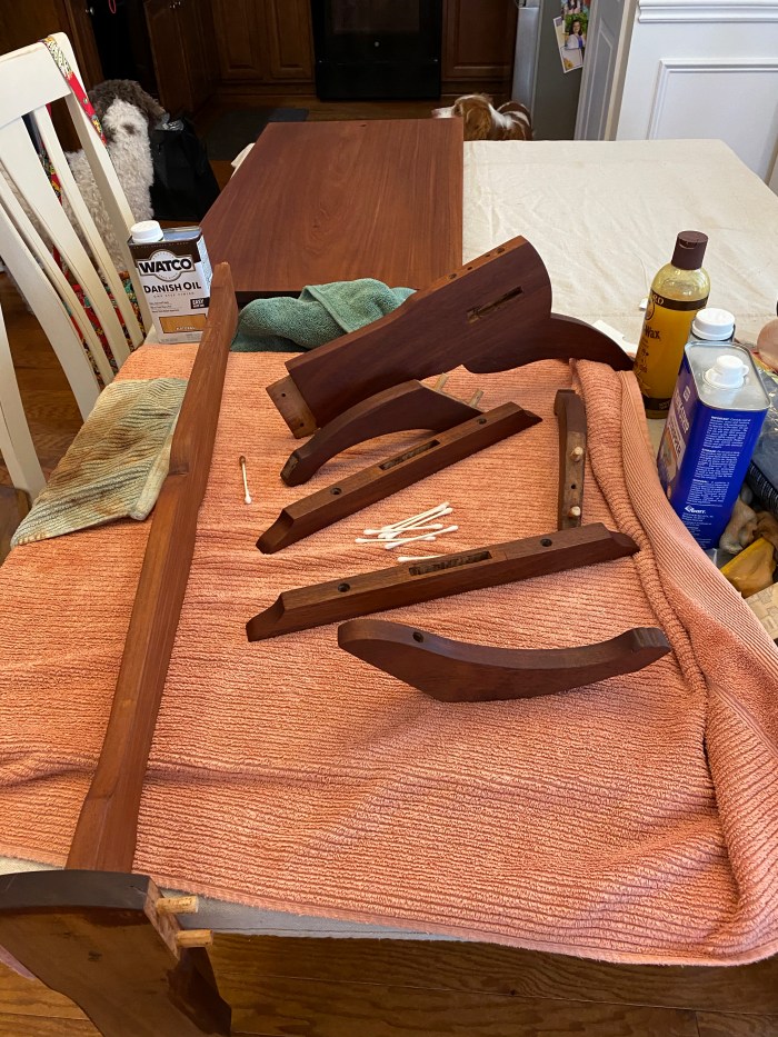 Once down to the bare wood with a final sanding with 340 grit sandpaper, I hand-rubbed three coats of Danish Oil to each individual part. Back together, I applied three more coats of Feed-N-Wax, a product with beeswax and orange oil—a remarkable product. That vintage mahogany responded just as I had hoped to the oil and beeswax. The finish now has a soft glow and a depth that I am not sure is possible with spray-on or brush-on finishes. And, one of the most practical reasons to use the oil and wax combination is that one need not worry about dust settling on the finish before it has dries.