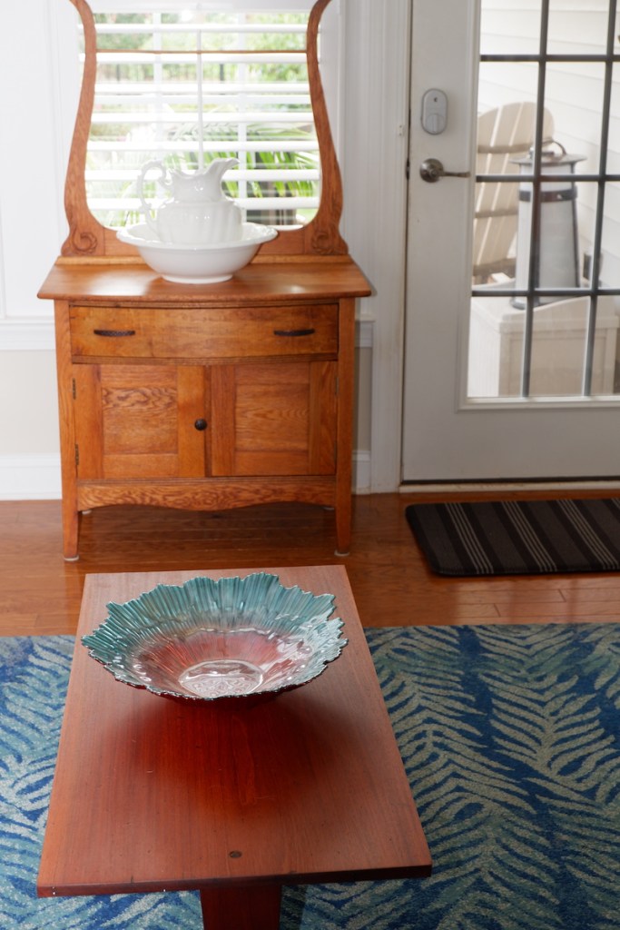 Today our antique ewer and bowl sit on the restored washstand just a few feet away from the mahogany Shaker-like coffee table, beautiful in its simplicity and the fine mahogany used in its construction. both pieces sit in the sunroom showing off their natural colors in the abundant sunlight.