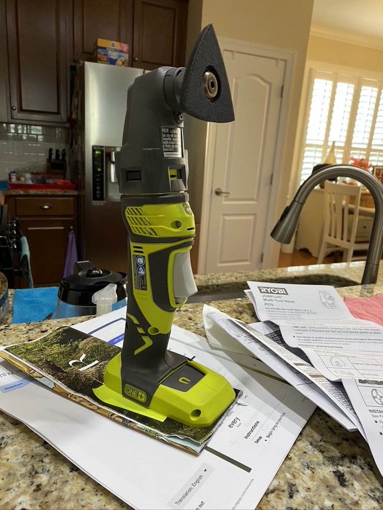 With Amazon as close as my iPhone, I added a battery-powered Ryobi Multi-tool using the same battery as the sander and air-pump. The thing and can take dozens of attachments—none of which come with it—meaning additional trips to Home Depot or Amazon. Darn.