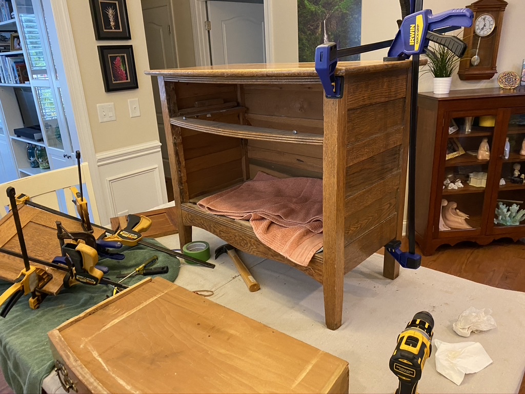 Even if one can see the potential in the piece, repairs are often needed to ensure that the finished product endures many decades after it is done. Has the wood been damaged or broken? Does it need to be taken totally apart and put back together with new glue? Or does it just need a bit of glue and clamping tight overnight? Clamps—another reason to visit the tools department.  One never has enough clamps—another maxim of the woodworker, I believe.