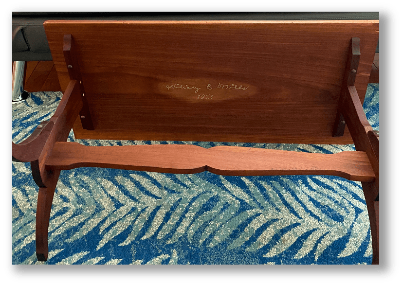 As I approached the end of my work on the coffee table, Bill suggested that I include the builder’s name since I definitively knew it to be my wife, Sandy’s father—Hiliary E. Mills. But where does one find the signature of someone who passed away more than four decades ago? I began with the obvious place—Sandy. No luck. She did not recall any document that we had where his signature appeared.