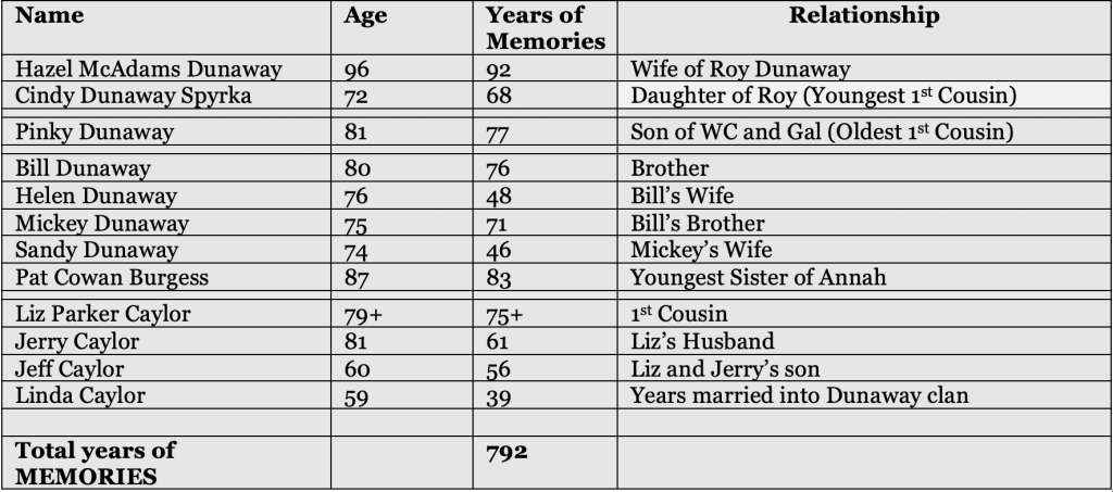 The table below represents my attempt at developing a means of melding together all the years of what it means to be a Dunaway. Certainly, this is not everyone. Finishing the gathering of memories will lie with you here and your direct descendants. Please keep the spark, the bond, the glue that has held us together fresh and strong by remembering the stories. Please write them down—old and new— and don’t worry about grammar or spelling. That is what computers are for these days. Worry about feelings—what it felt like when it happened and what it feels like right now as you remember it.