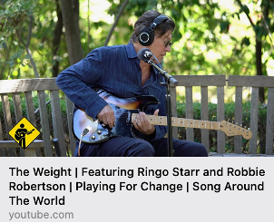 Be sure to check out The Band’s founder, Robbie Robertson, writer of “The Weight,” playing and singing it simultaneously with musicians worldwide on YouTube at https://m.youtube.com/watch?v=ph1GU1qQ1zQ.