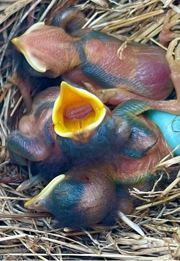 Sandy and I love to sit on our patio and watch our pair of lovers work their little feathers off every year to ensure their babies hatch and grow into fledglings who leave the nest. But before that event, mother and daddy bluebirds work even harder finding bugs and worms to feed their brood. We have a bird feeder in our yard, but blue birds don’t usually eat seeds. No. They work their feathered fannies off to find those bugs and worms.